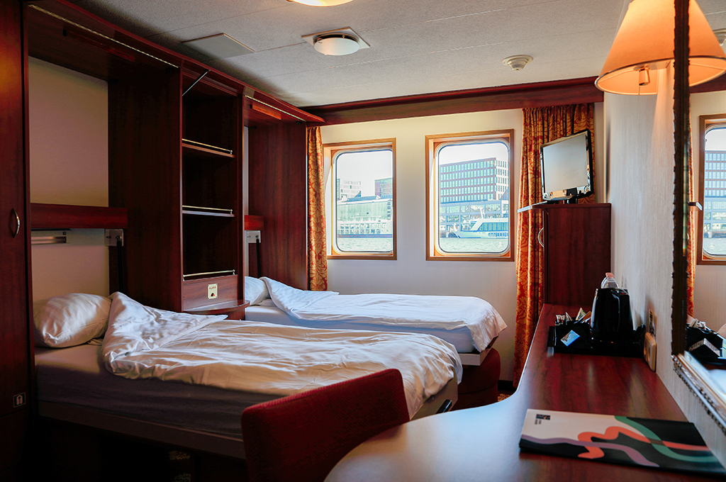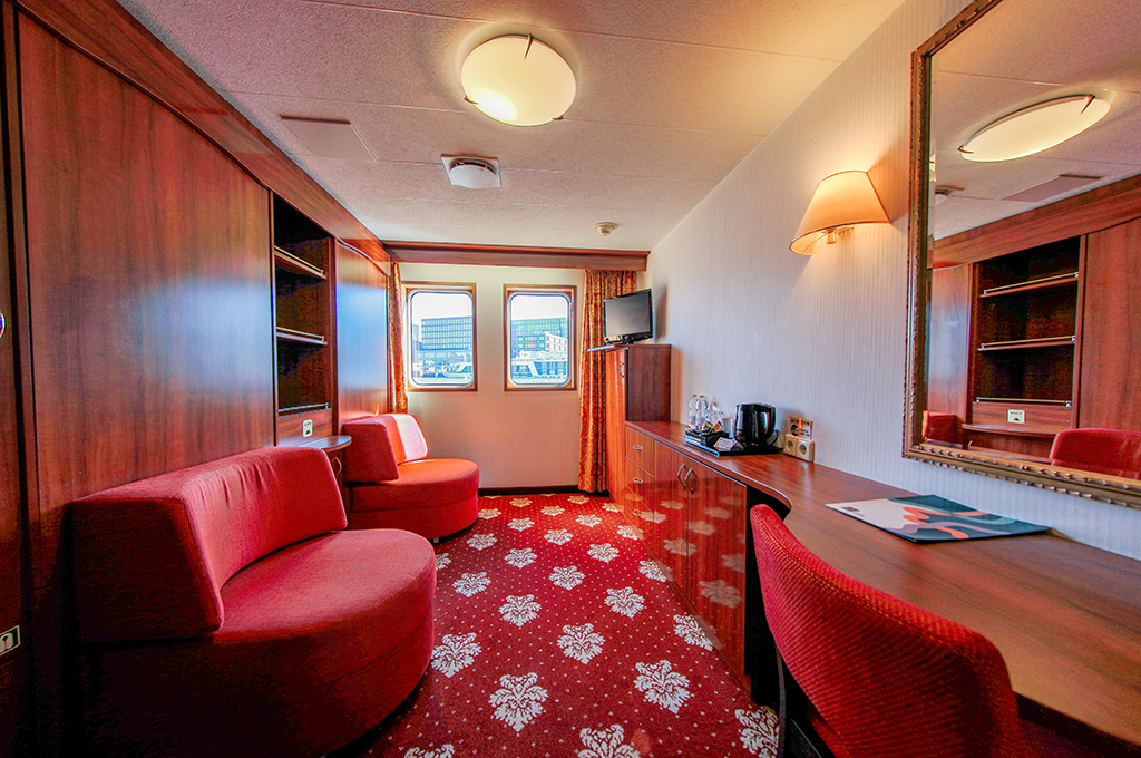Alle Kabinen sind Außenkabinen und verfügen über DU/WC, TV, Telefon, Safe, Klimaanlage/Heizung und hochwertigen Wohnkomfort. Kabinen auf dem Rivadeck bieten französische Balkone, die Wohneinheiten auf dem Floradeck umfassen große Panoramafenster.